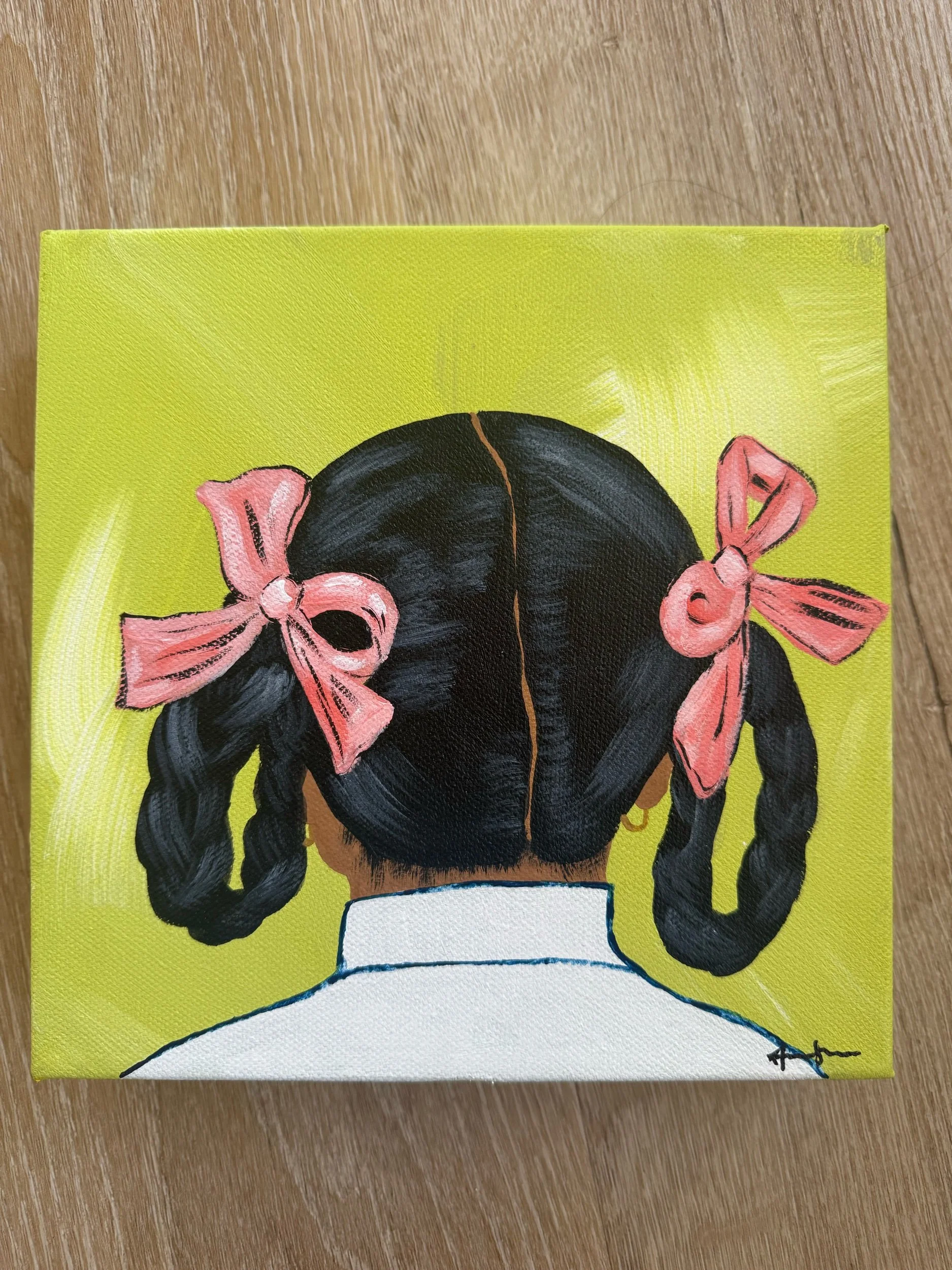 This original pairing is of a young school girl in India. The braided pigtail hairstyle in this piece is a common hairstyle in India and other south Asian counties and is also part of the school dress code for many public and private schools. The hairstyle signifies the young girl given the opportunity to obtain an education and create a future for herself. Gender inequality is still prevalent in south Asian countries leading to disparities in education, health, and financial stability.