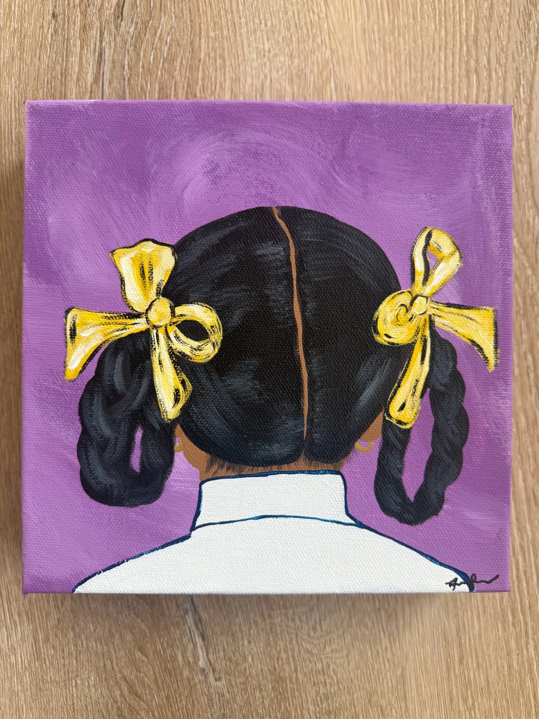 This original pairing is of a young school girl in India. The braided pigtail hairstyle in this piece is a common hairstyle in India and other south Asian counties and is also part of the school dress code for many public and private schools. The hairstyle signifies the young girl given the opportunity to obtain an education and create a future for herself. Gender inequality is still prevalent in south Asian countries leading to disparities in education, health, and financial stability.
